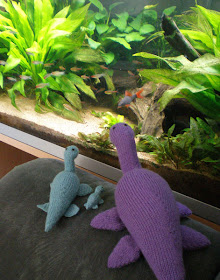Well, I finished the custom order I mentioned I was working on last week. These plesiosaurs were shipped yesterday and I miss them already. *sigh* I'm just so happy about how they turned out.I might have to make a big Nessie or two for myself to sit by the aquarium. I think the red-finned Fishmeat (seen chatting with the plesies in the photo) misses the company as well.